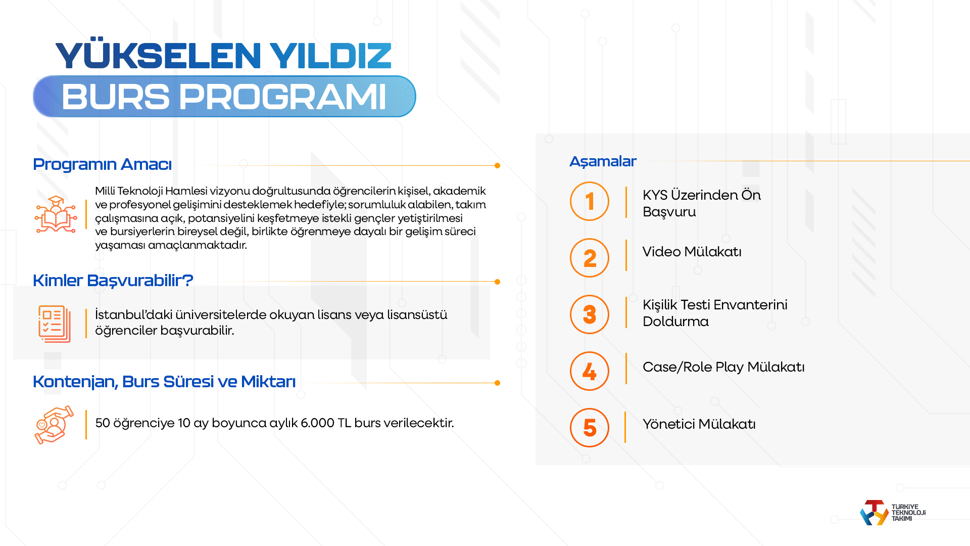 Özdemir Bayraktar Milli Teknoloji Burs Programı 2026 yılında; “Yükselen Yıldız Burs Programı”, “Eğitim Desteği Burs Programı”, “Eğitmen Mentör Burs Programı”, “Sen Geleceksin Burs Programı”, “T3 AI Lisans Araştırmacı Burs Programı” ve “Etik İletişim Programı” olmak üzere altı kategoride uygulamaya alınacak. Her bir başlık, farklı yaş grupları ve disiplinlere yönelerek gençlerin akademik gelişimlerini desteklemeyi, sosyal sorumluluk bilincini pekiştirmeyi ve teknolojiye yönelik ilgilerini güçlendirmeyi hedefliyor.