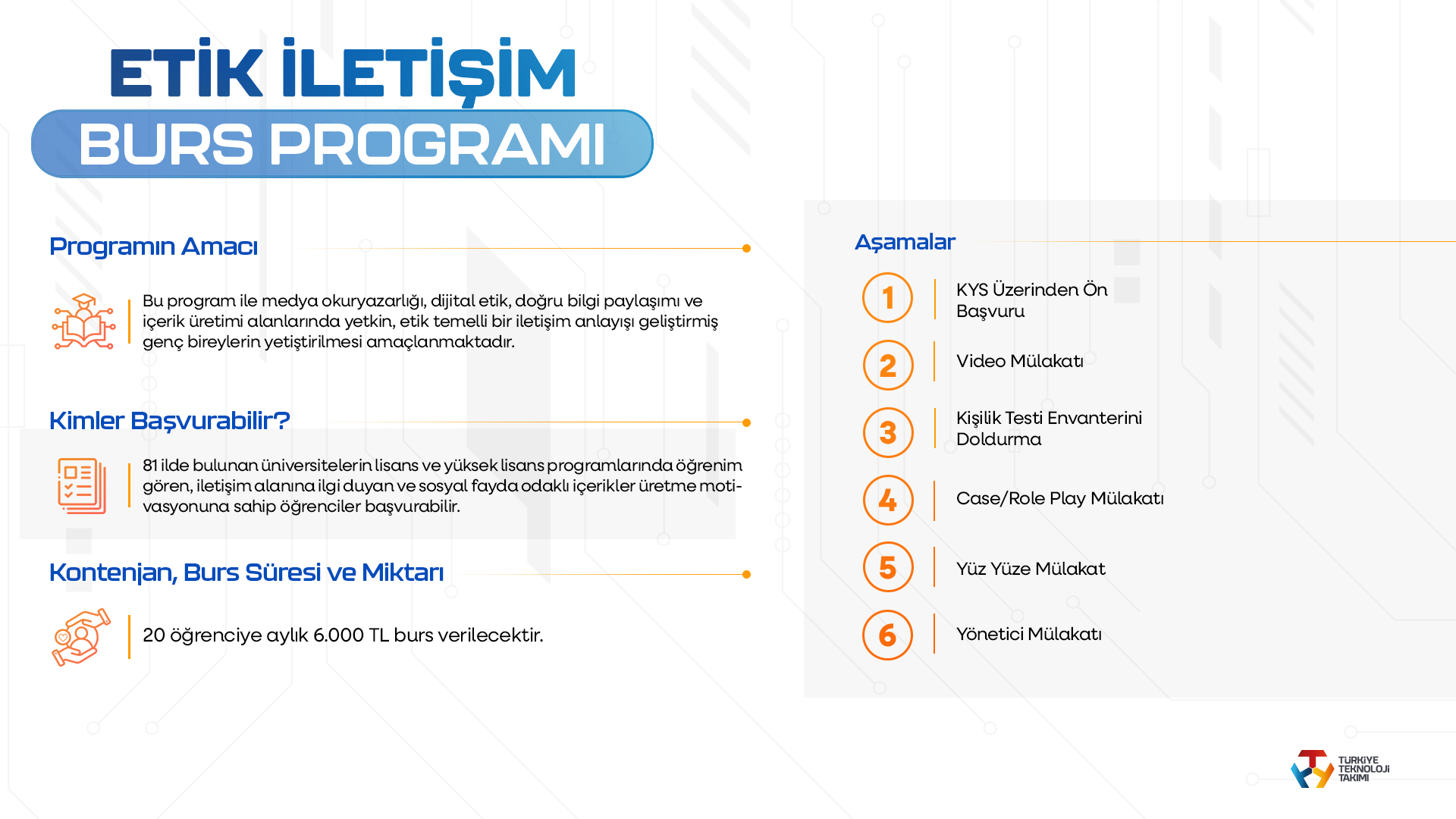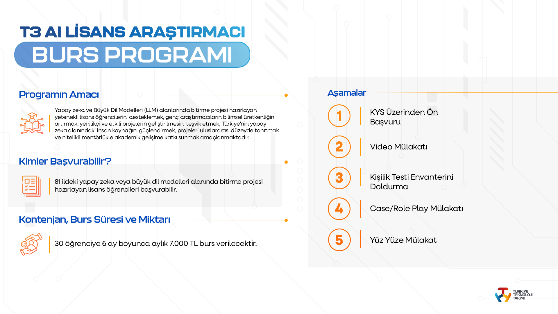 Öte yandan yapay zeka ve büyük dil modelleri üzerine yoğunlaşan T3 AI Lisans Araştırmacı Burs Programı ise öğrencilere 6 ay boyunca aylık 7 bin TL burs sağlayarak teknoloji alanında yenilikçi projelerin gelişmesine katkı sunacak. Bunun yanında, yaratıcı medya çalışmaları, senaryo, kurgu, yazı ve sunum becerilerine odaklanan Etik İletişim Programı ile lisans ve lisansüstü öğrencilerine 10 ay boyunca 6 bin TL burs imkanı verilecek.