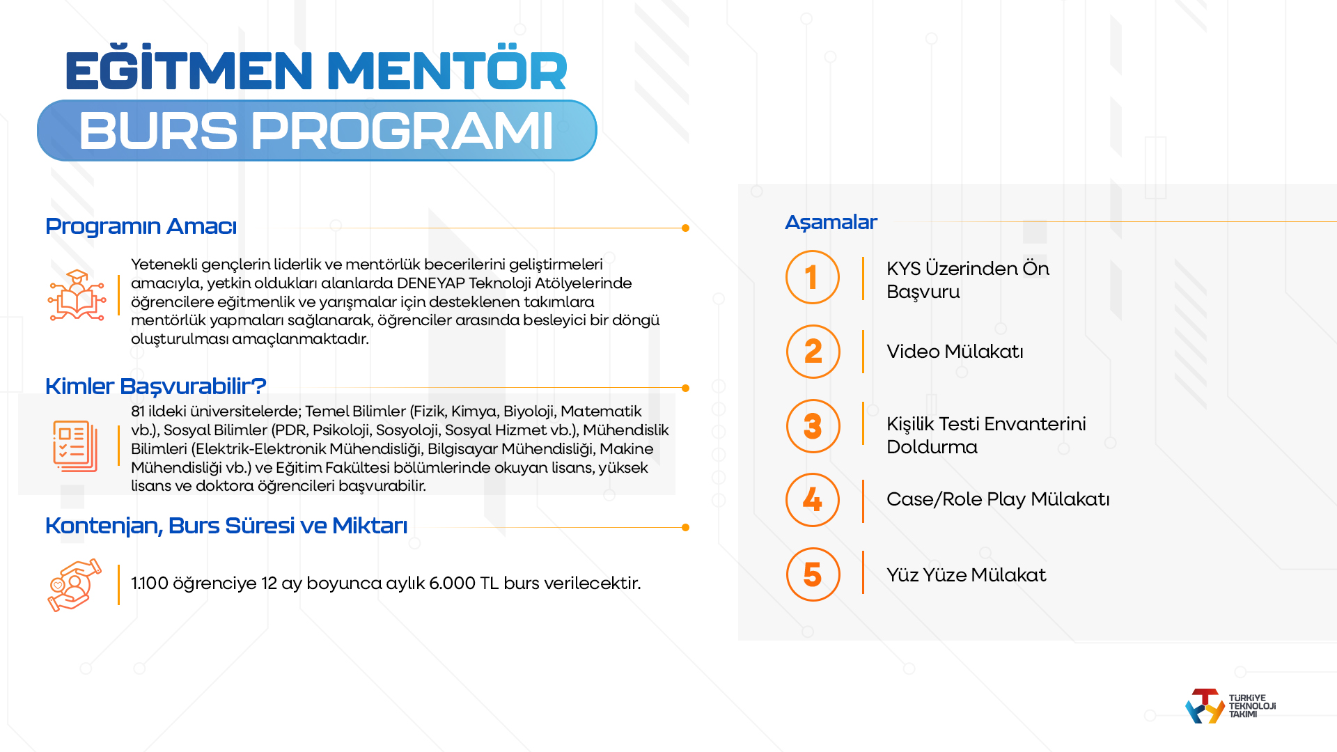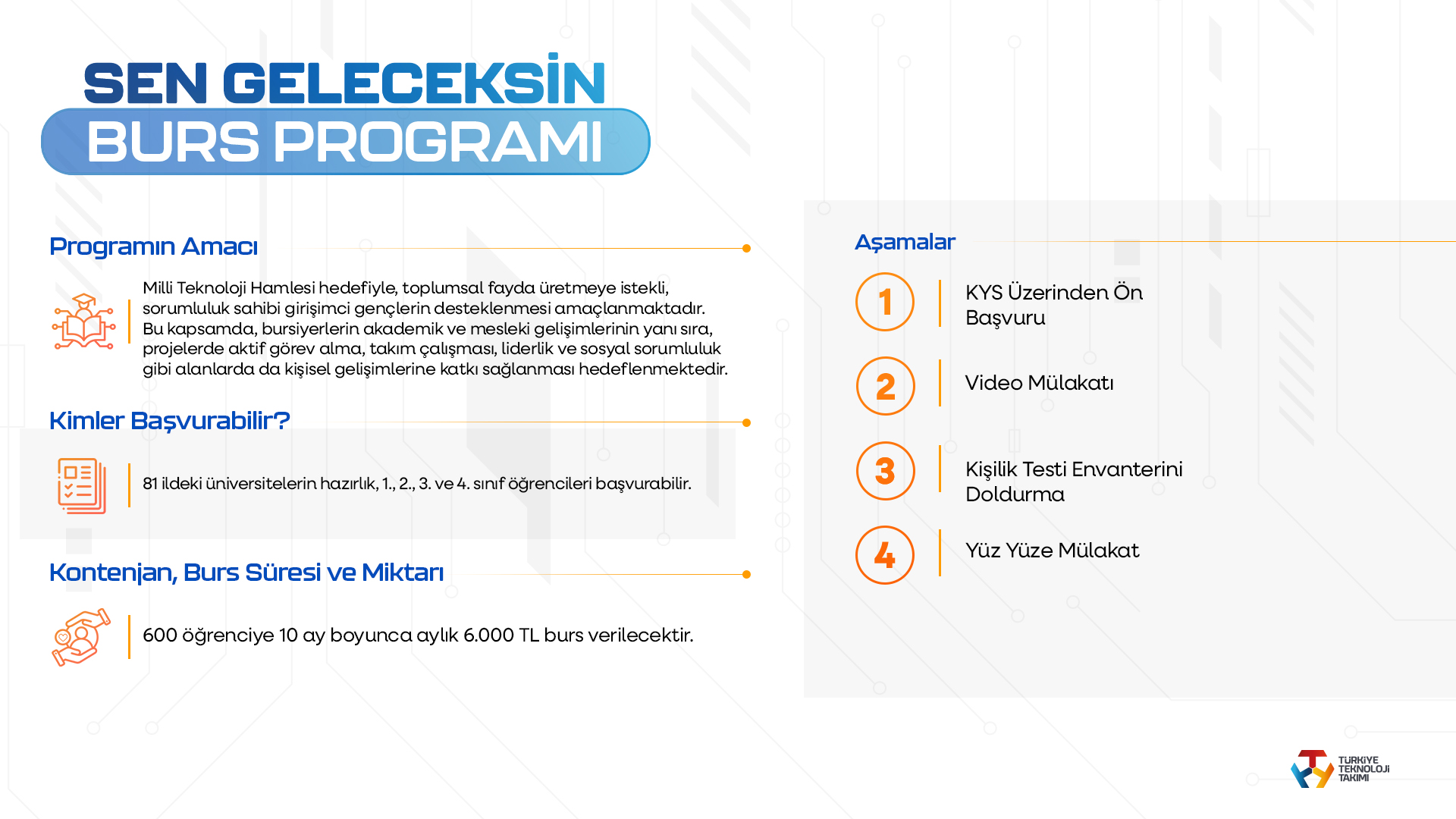 Gençlerin eğitici rol üstlenerek akranlarına rehberlik etmelerini hedefleyen Eğitmen Mentör Burs Programı ise, Temel Bilimler, Mühendislik, PDR, Psikoloji, Sosyoloji ve Eğitim Fakültesi öğrencilerinden bin 100 öğrenciye 12 ay süreyle aylık 6 bin TL burs imkanı sunacak. Ayrıca, üniversite öğrencilerini toplumsal fayda projelerine katılmaya teşvik eden Sen Geleceksin Burs Programı kapsamında üniversite öğrencilerine 10 ay boyunca 6 bin TL destek verilecek.